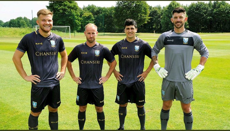 The away strip, shown off in the picture by Jordan Thorniley, Barry Bannan, Fernando Forestieri and Keiren Westwood, will get its first outing at Wigan on the opening day of the season.